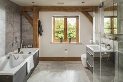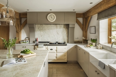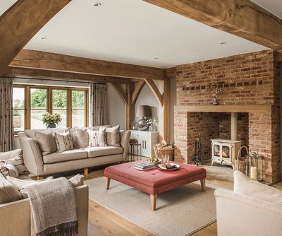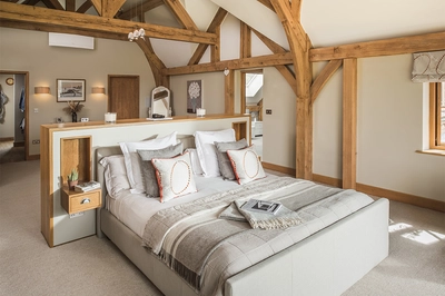 The heart of the home is a beautifully designed Harvey Jones kitchen, blending modernity with farmhouse chic. A cream electric Aga, Belfast porcelain sink and traditional mixer tap are set off by sleek kitchen units. The colour scheme also harmonises with the natural hues of the oak frame, creating a warm inviting space.