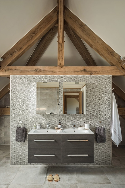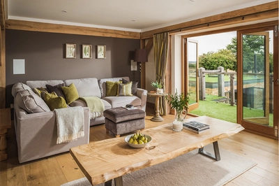 The ground floor is designed for spacious, open-plan living. It boasts an airy atmosphere thanks to its dual aspect design, with extensive glazing at the front and rear, allowing natural light to flood through the entire space. Ground-source heating and our WrightWall Natural premium eco-insulated panels ensure perfect warmth throughout, complemented by a cosy wood-burner in the scrubbed brick fireplace for particularly chilly evenings. Alternatively, whenever it’s too warm, the whole space can be opened up to the refreshing elements thanks to the huge bi-fold doors at the back.