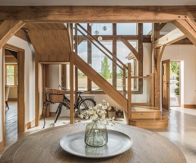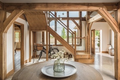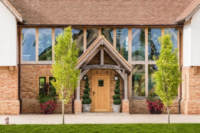Phillip and Sandra’s manor house is a glorious H-shaped statement. It features a central section flanked by two jetties and a stout oak porch that introduces visitors to the centrally-positioned front door. This grand entrance sets the tone for the couple’s entire dream build.
