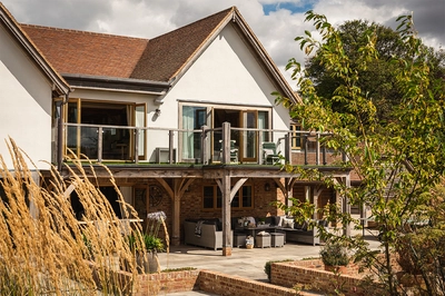Upstairs, the reduction in the number of bedrooms from the originally planned seven to four allows for more substantial and luxurious rooms. Each double bedroom features a walk-in wardrobe and an ensuite, styled with tiles from Mandarin Stone. The master suite, in particular, offers spacious luxury, complete with double doors leading to a balcony that overlooks the beautifully landscaped back garden. The generous depth of the balcony gives Phillip and Sandra space to relax as well as protecting those sitting below from the elements.