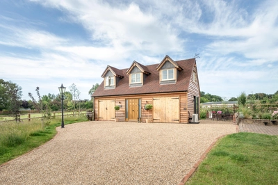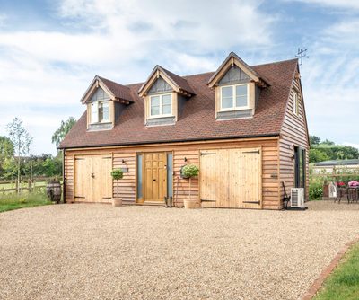Looking at the family’s oak frame room above garage from the front elevation, there are many design considerations which instantly grasp your attention. Two impressive timber garage double doors with detailed ironmongery finishes sit either side of a traditional solid oak front door featuring side panels, while three dormer windows are positioned symmetrically above and have been beautifully framed with timber and lead, taking centre stage.