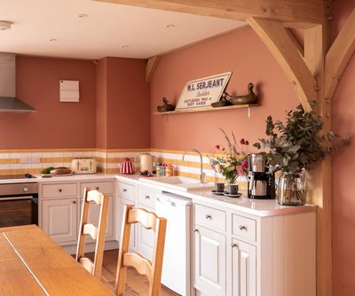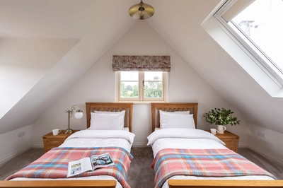 The downstairs comprises a spacious storage area on the left-hand side and an open-plan kitchen/dining/living room within the subsequent two bays, in addition to two twin bedrooms, a bathroom and their office upstairs.