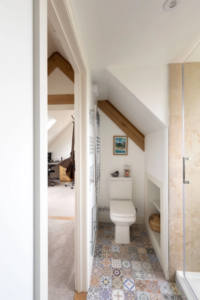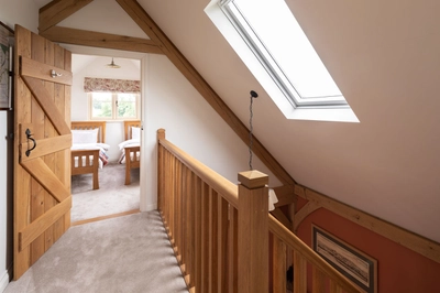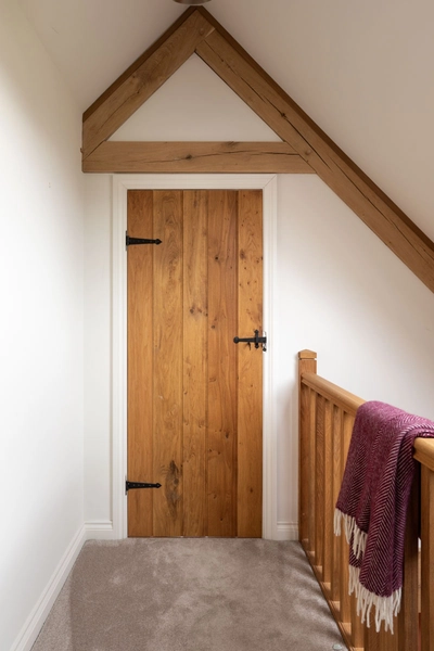 Once inside, their bespoke oak frame carefully carves out each living area and draws you through the spaces. In the kitchen, a triple casement window and bifold doors which are products within Excell Timber’s portfolio, welcome natural light to flood in and add to the sense of space. Before travelling up to the landing, attention must be paid to the Serjeants’ oak staircase from Woodside Joinery, which is illuminated by a rooflight overhead.