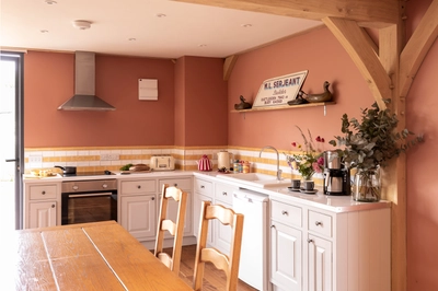To work in harmony with the wide selection of timber joinery installed both inside and out, larch weatherboarding encases the entire exterior of the Serjeants’ garage, naturally blending it into their rural surroundings, and their build is completed with a clay tile roof.