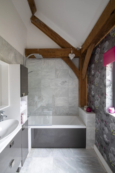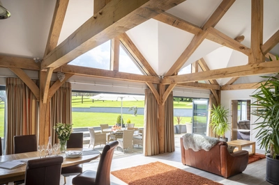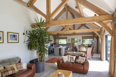 Once inside, you arrive in their spacious, open-plan kitchen/dining/living room which benefits from high ceilings, emphasised by amazing king post oak trusses.