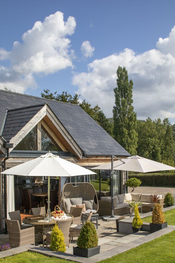 Before stepping through their oak front door, which has grey, aluminium windows positioned symmetrically either side, you are greeted by an oak frame porch with features that have been carefully designed to mirror the exterior of their home and suggest the frame which is awaiting inside. This elevation is also positioned to the east facing their stables.