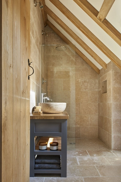 Their additional open-plan living area pictured below, which flows on from their kitchen, was built around the existing chimney of the original bungalow to allow the stonework to become a contrasting texture to the oak frame and glazed opening. Stepping onto the first-floor, Phil and Claire wanted to create another bedroom which would benefit from its own en-suite.