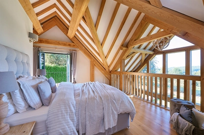 The face glazed gable allows a true representation of the structural frame inside to be shown from the exterior. Alongside their striking gable, the Bakers’ two storey vaulted mezzanine feature of this oak frame extension and large opening doors help to blend their garden and views over the rolling vista of Stroud with both the downstairs living and the additional upstairs bedroom.