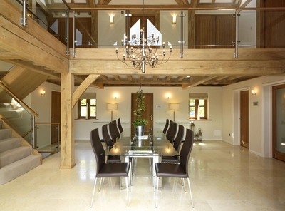 The ground floor of their home is built with brick externally and has oak framing dropping down to the floor on some internal partitions. You enter Martin and Tracey’s home through a brick porch with dragon beams and jetties over. This gives a striking entrance as you walk over the glazed panel in the floor that allows you to look down into the wine cellar below, and then move through to the vaulted dining hall. On the ground floor there is a sitting room, large office, dining entrance hall, WC, utility room, kitchen and large vaulted family room.