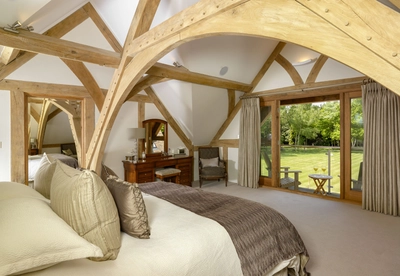 On the first floor, one wing has been given to their master bedroom, dressing room and en-suite. The master bedroom benefits from large French doors opening out onto a covered balcony with wonderful views up the garden to the woods beyond. The en-suite is pure luxury, with an oversized his and hers bath and large tiled shower cubicle set within the vaulted oak roof space.