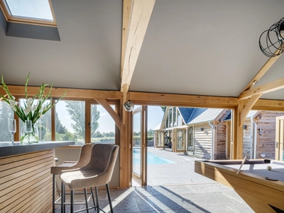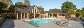 The Gallimore’s decided on a modified three-bay Highgrove garage from our single-storey oak frame garage range as the basis for their pool house. They incorporated two sets of bi-fold doors opening out onto the pool. Velux windows were placed in the roof and face glazed panels were incorporated in each gable end creating a bright and airy space. Using a slightly modified version of our Highgrove design meant the build itself was more cost-effective and was based on a standard model which allowed their project to move quickly through the earlier stages of the process.