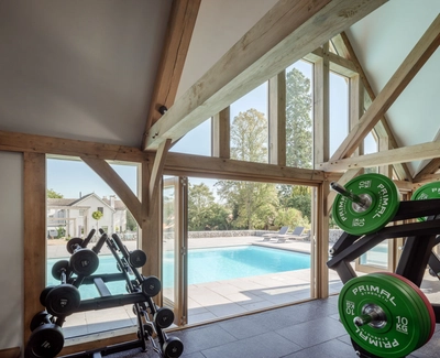 “The main requirement for the design of the gym was scale, as this outbuilding needed to house all of the couple’s equipment,” explains George. “This, as expected dictated the floor area. The height of the building was also a consideration: needing to allow enough space for squat racks and an extended bar position meant that a vaulted roof was key. These elements lent themselves perfectly to a modified Gloucester garage from our room above range.