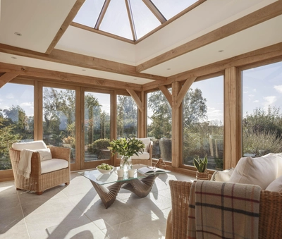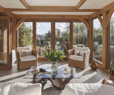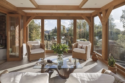 Julian and Phillipa chose Oakwrights to improve the living space of their substantial farm house on the outskirts of Shrewsbury. The couple got rid of what Julian describes as “a dilapidated conservatory”. Now, two sets of double doors from their sitting room lead into their new oak frame orangery which, Julian adds, “effectively doubles our living space”.