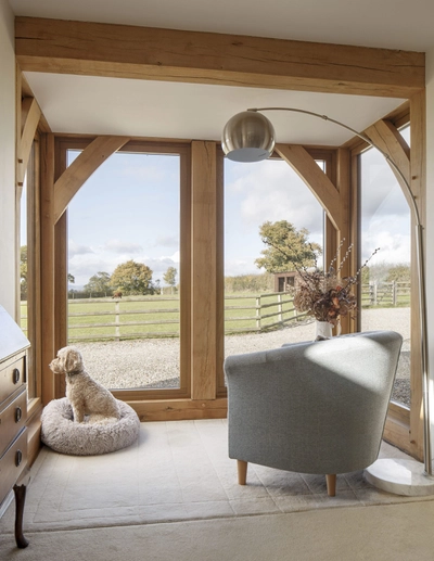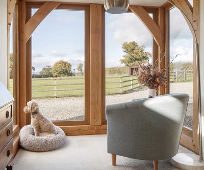 The decision to modify the initial design, adding an extra glass pane and removing the dwarf wall, provide a more balanced look to the oak frame extension. It also integrates the side of the house where the Armitages have added other oak elements, namely a new hall window and a bay window, with balcony above. Phillipa is particularly pleased that the new large panes afford views the smaller windows in their “really old house” do not provide.