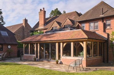 The 10m wide oak frame orangery extension is sufficiently roomy to accommodate a dining table as well as comfy chairs and a sofa to relax on after dinner. And when the weather is inviting, Paul and Karen can peel back the bi-fold doors for refreshing views over their back garden.