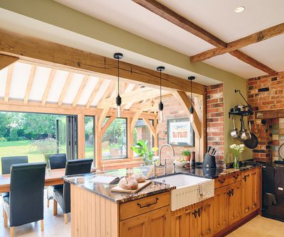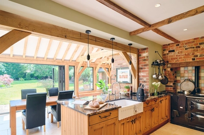 The addition of three glazed walls and large glass roof-light means the whole interior space, including the cooking area, is now much better lit than it was before the build. The natural beauty of green oak complements the kitchen’s scrubbed brick walls and supporting post sited between the new and original parts of the home.