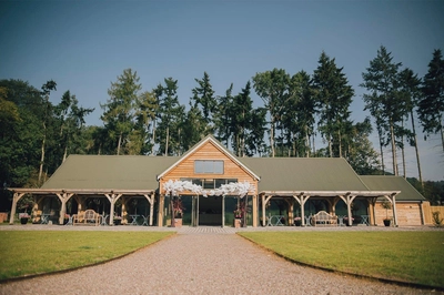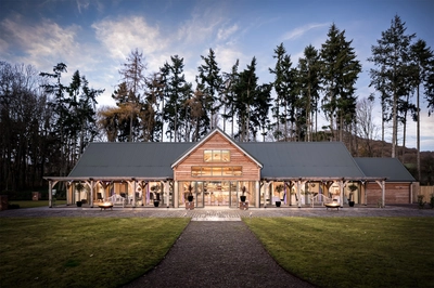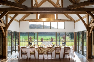 Positioned before woodland and rolling farmland, the setting seamlessly snuggles this oak framed wedding barn in Herefordshire into its private position, aided by the beautiful patina already gained by the external weatherboarding.