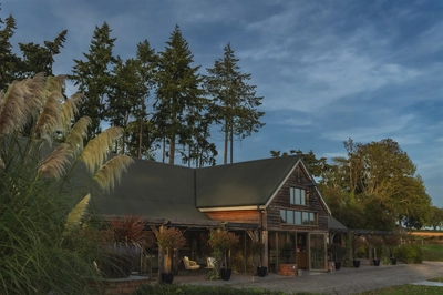 One of the first striking architectural design features you’ll be drawn to is the barn’s floor-to-ceiling windows that open along the whole front and offer an al fresco feel throughout the year.