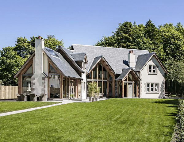The posts of the bespoke aisle frame line up from left to right creating the stunning, elongated barn-style structure, and the full-length glazing shares the incredible views beyond.